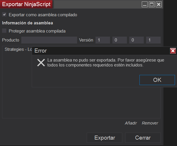 Error al exportar estrategia