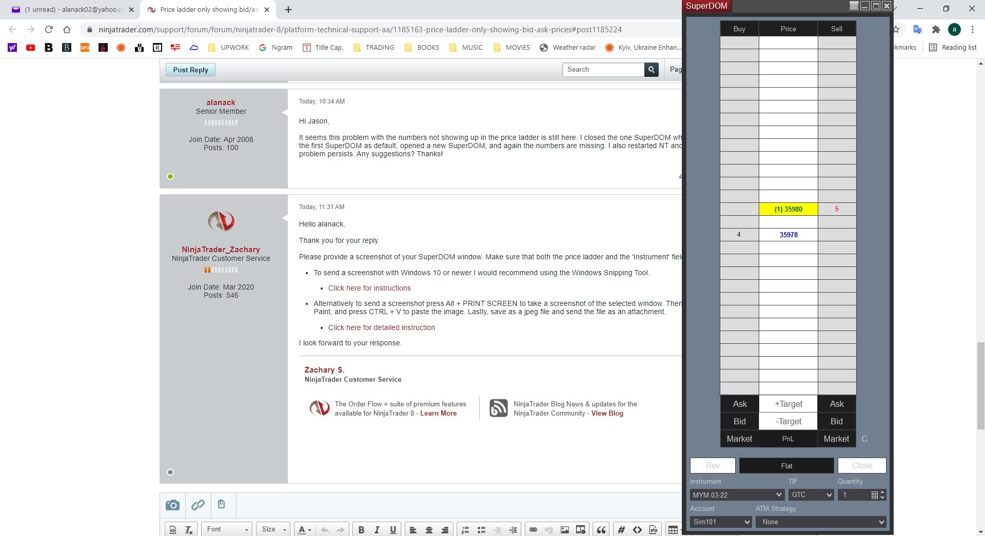 I opened a new SuperDOM (without closing the first) and the problem is fixed. The problem was with the YM, using TWS. I guess I can just go with the new SuperDOM if you don't think there might be an underlying issue that should be addressed. However, I was next going to ask you about the MYM micro-emini contract. I was finally able to find it, but when attempting to add it a window states "You must set a value for the "Master Instrument" field. Of course, I don't know what should be entered here. Thanks!