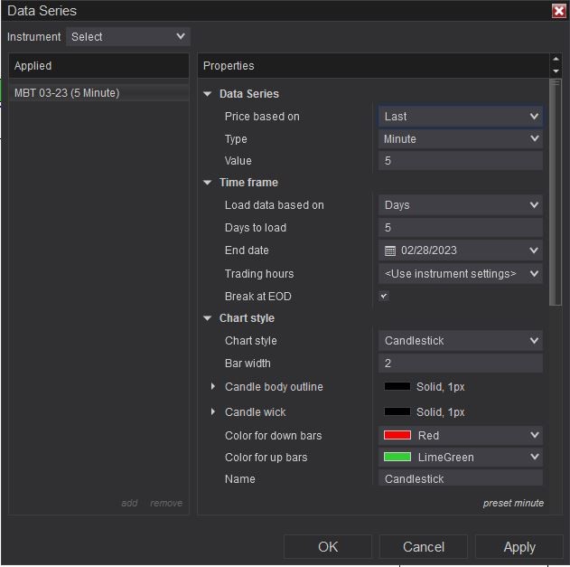 Then please take a screenshot of your chart and Data Series settings. My MBT chart currently looks like this: