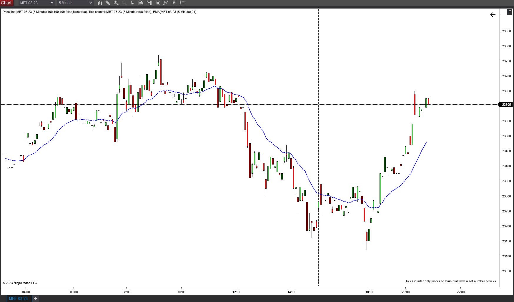First, I would open Chart Trader and check if the Ask and Bid prices are loading the same numbers as the data on the chart. If they are not populating and show values of 0, this would indicate that you do not have live data for the MBT. Please be advised that it appears that the MBT 03-23 is a little lower volume today, hence the dashes instead of full candlesticks.