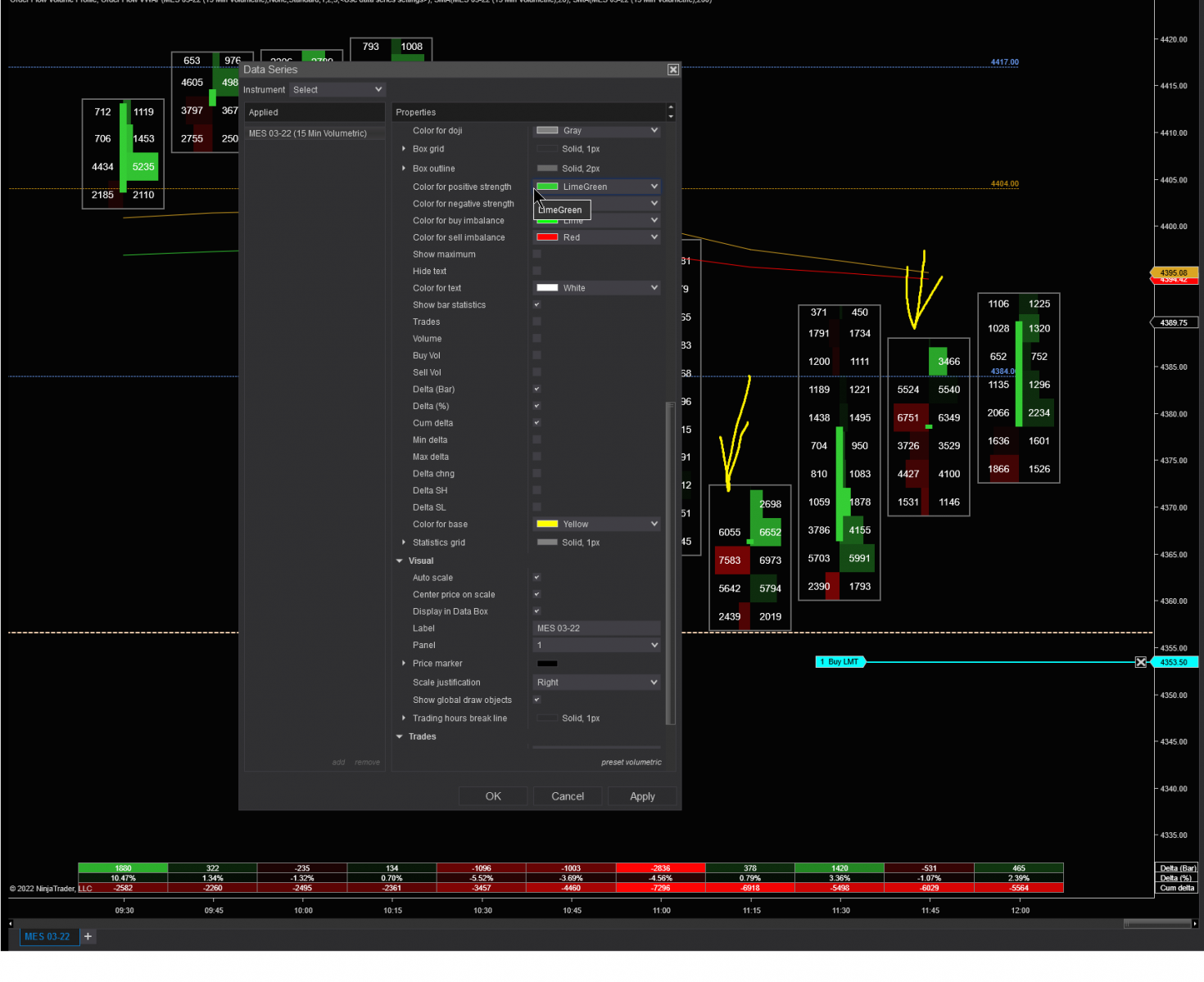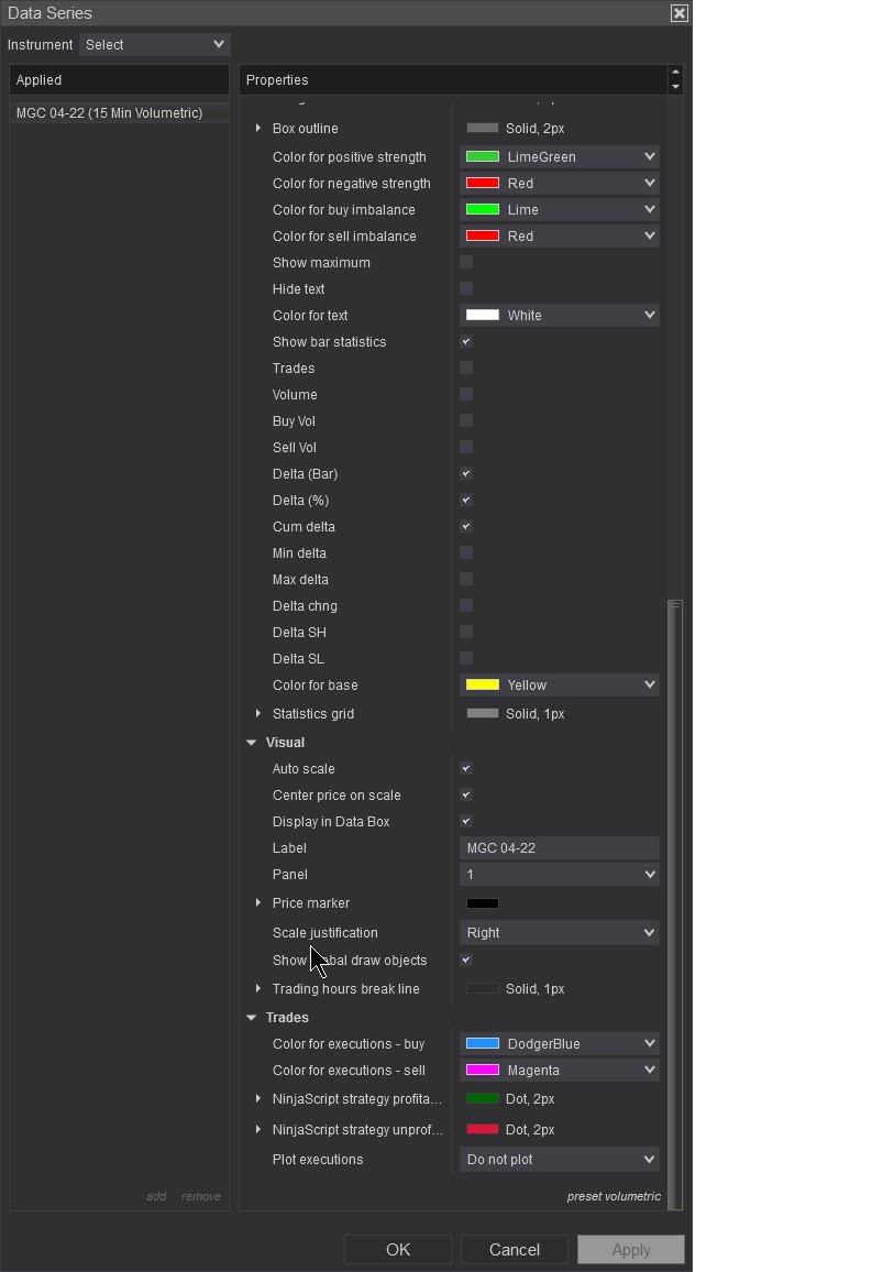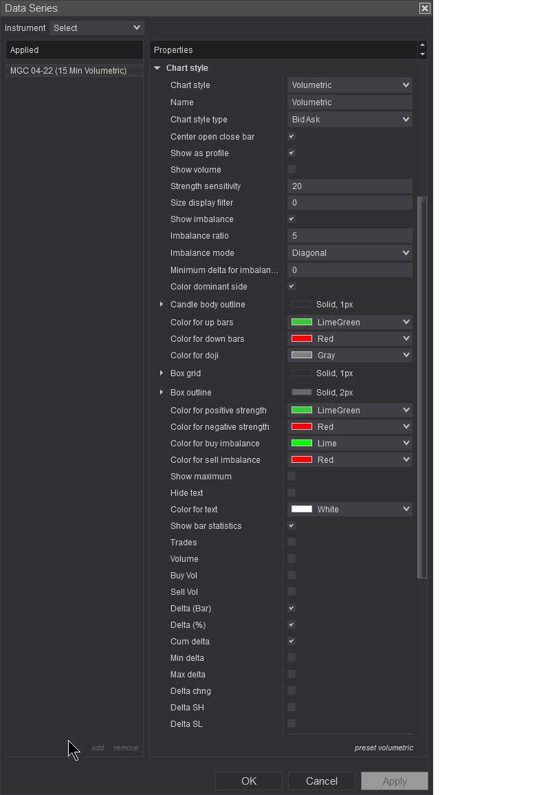 Can you please provide me a screenshot of the Order Flow Volumetric bar settings so I can test it on my end.