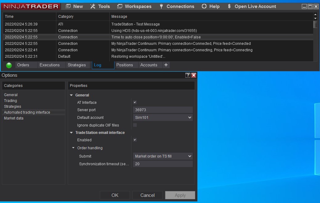 With regard to configuring TradeStation to send orders into an account within NinjaTrader, you will need to follow the configuration steps from our Help Guide and also create a workspace that follows a very specific naming convention so that TradeStation knows which account to send the orders to. You may view an explanation of the workspace naming conventions along with examples at the link below;