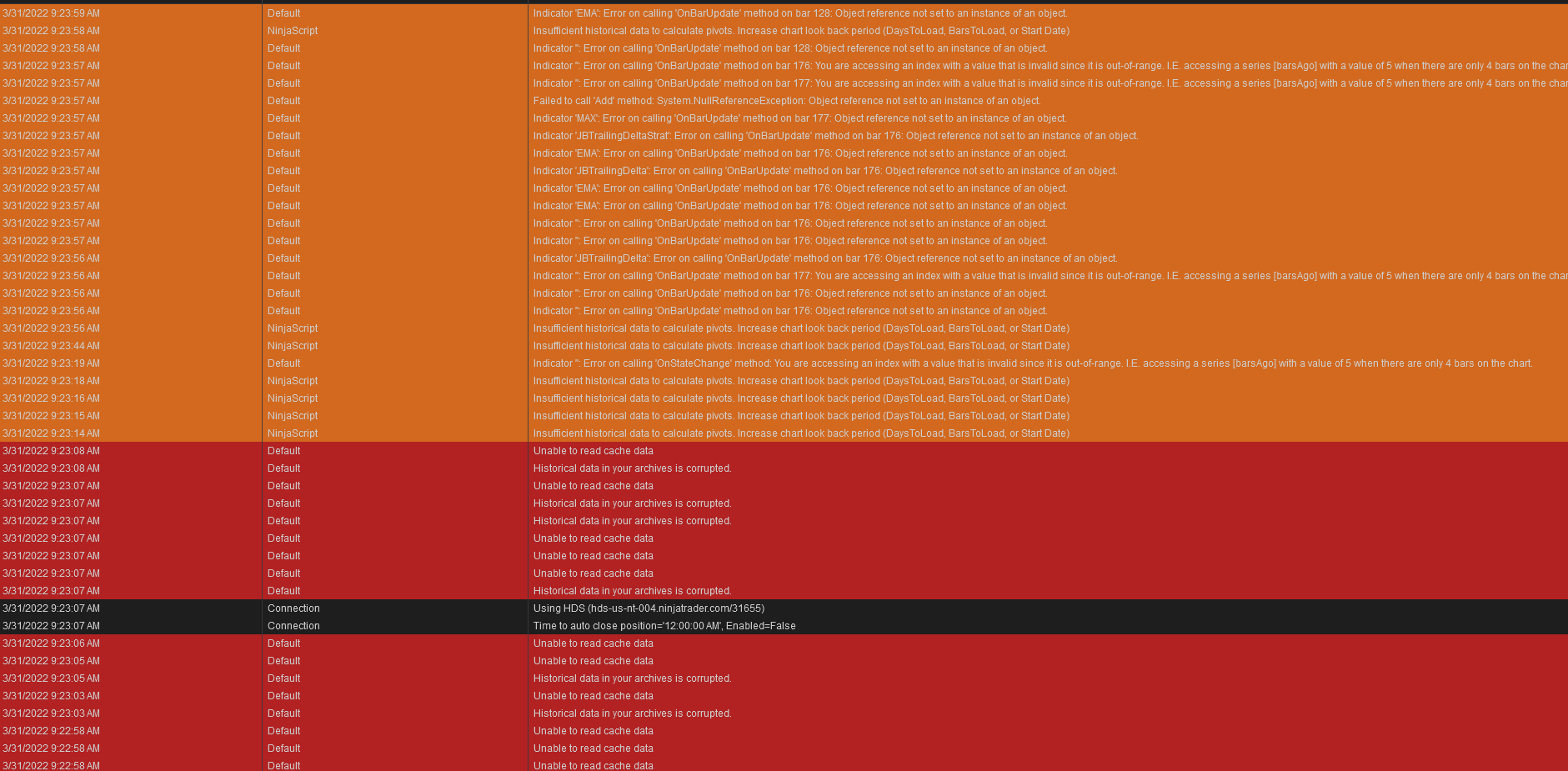 For some weeks now, NT8 has an error message every time I close it saying "Unable to clear cache" and now when I loaded my workspace it specifically told me to reload tick data from today. Despite doing so my tick charts will not work.