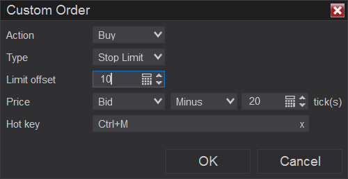 For example, if you create a custom Hot Key to place a Stop Limit order, you could specify that Stop Price for the Stop Limit order is set to Bid minus 20 ticks. Then, you would use set the 'Limit Offset' field to 10 ticks and the Limit Price of the Stop Limit order will be 10 ticks from the specified Stop Price (Bid mins 20 ticks) of the Stop Limit order. See the attached screenshot demonstrating this.
