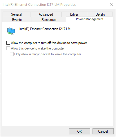 Network Adapter is not set to save power, It's unchecked.