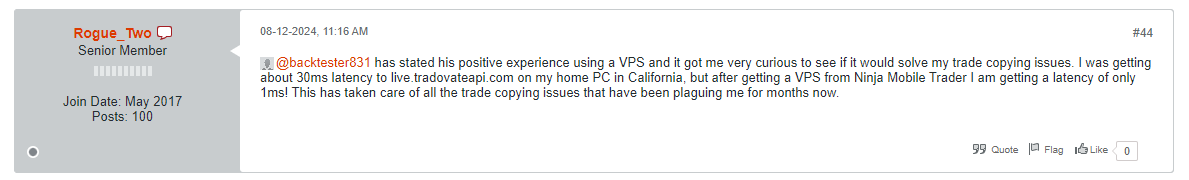Same for me, I had terrible slowness when running ninja on my local computer but since switching to NinjaMobileTrader VPS, it's been very smooth even through market open volatility and new events. The zero slippage on copied trades to multiple prop accounts is also a huge plus. No affiliation, just a very happy customer.