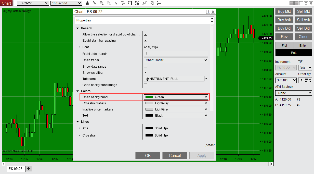 Instead, why don't you try changing the background in the properties and saving this as a template / preset for new charts as suggested in post #2.Chelsea B.NinjaTrader Customer Service