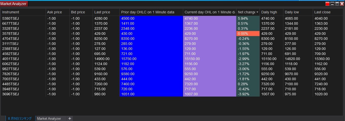 The attached screenshot will be from the TradeStation chart, but I think the attached screenshot is painted in light blue on the ones that have achieved 5% or more at the close, and I would like to do the same on the NinjaTreder platform.