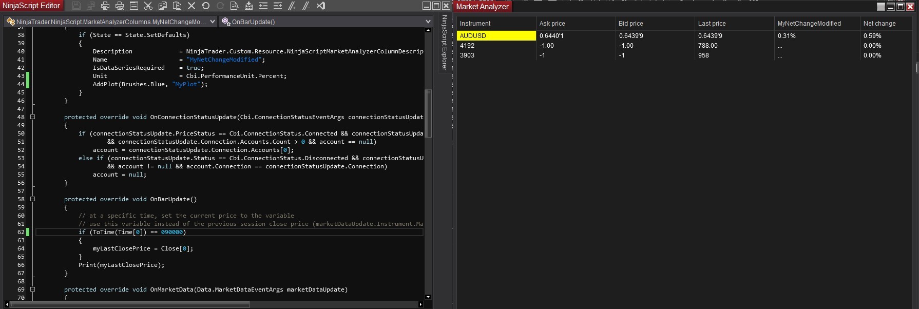 When I changed where the code should be placed, it showed up in real time in NinjaScript Output and Market Analyzer for the AUDUSD symbol, but not for the Tokyo Stock Exchange symbol.