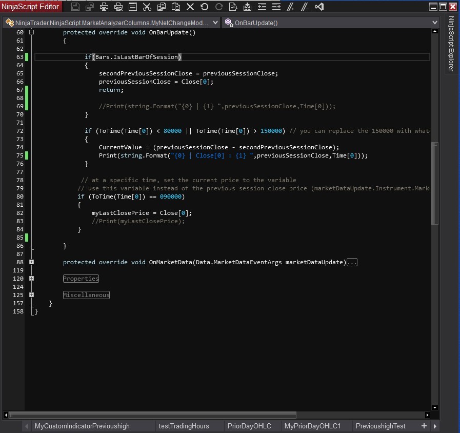 The latest screenshot script seems to only find it on line 63 (Bars.IsLastBarOfSession), and Bars.IsFirstBarOfSession is missing.May I have you print the time and the value of both Bars.IsFirstBarOfSession and Bars.IsLastBarOfSession above the condition that sets these variables?
