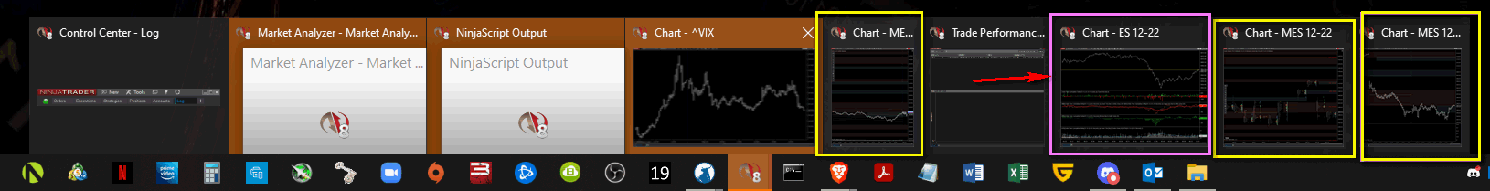 Attached is an image of the charts in the work space. I have highlighted several charts in YELLOW, that show the symbol as MES, these charts have the drawings duplicated on all of them. One chart you will see I highlighted magenta, and this chart is the ES, that has no drawings, but also has up/dntick studies on it.