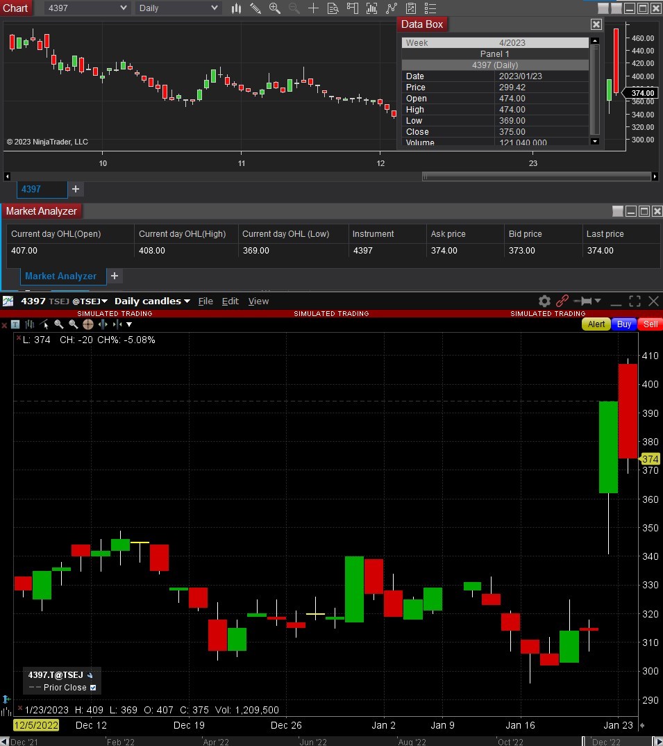 The difference is as shown in the attached image, both TWS and IB API seem to have the same opening price (407 yen) and high price (409 yen), etc. (comparison at the opening), but the NinjaTader platform has an opening price of 474 yen and a high price of 474 yen.