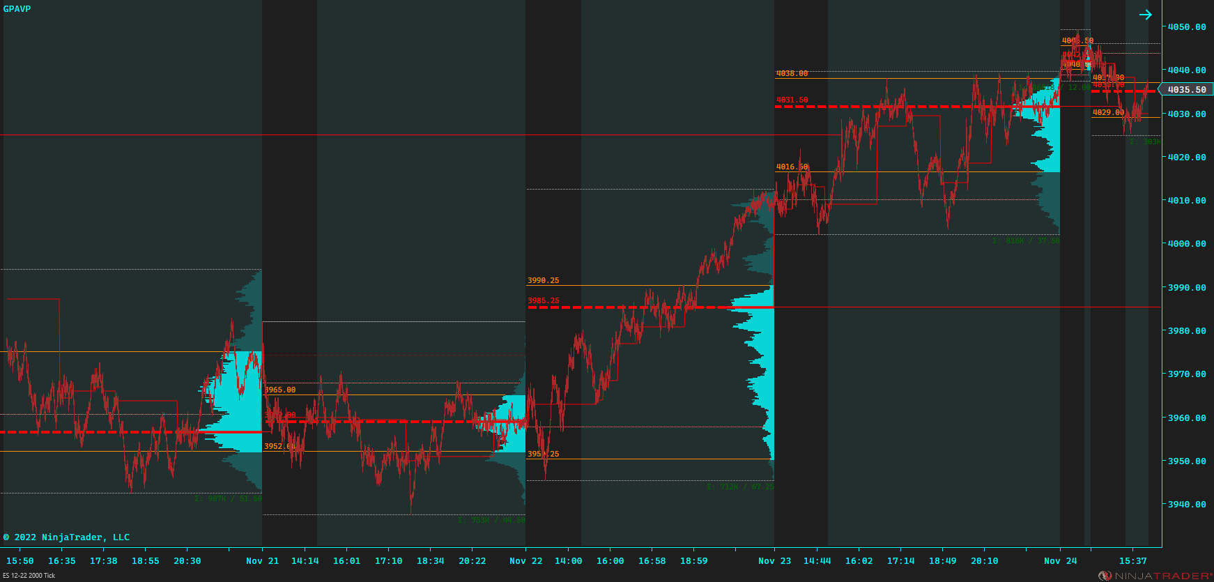 I applied the Order Flow Volume profile to a chart of the ES 12-22 future with a custom Trading Hours template set to split the trading day into an ETH session followed by an RTH session.