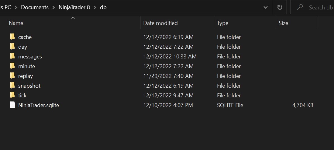 - Select My Documents--> NinjaTrader 8--> db--> "NinjaTrader.sqlite" file (may only say 'NinjaTrader' depending on your Windows File Explorer settings)