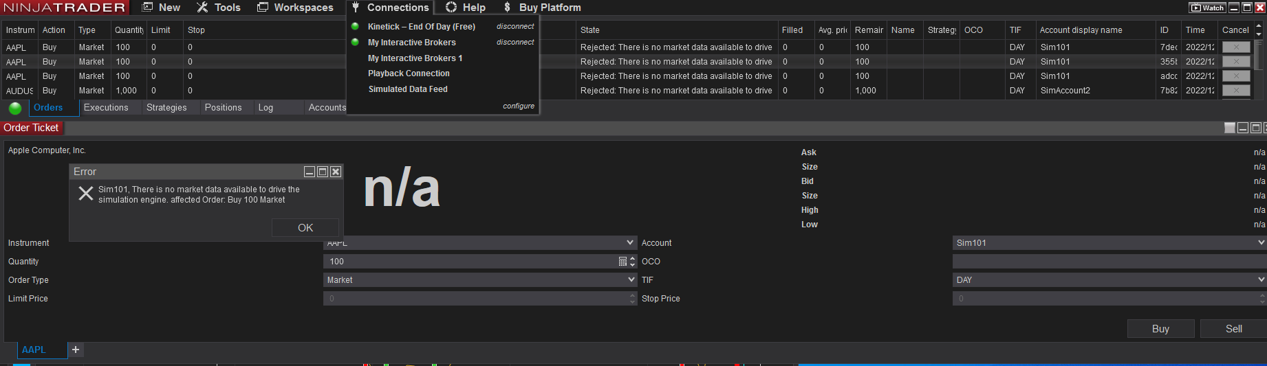 However, the I think the NinjaTrader platform has Kinetick free by default, and I connected my IB account with it, but I got an error message as shown in the attached image.