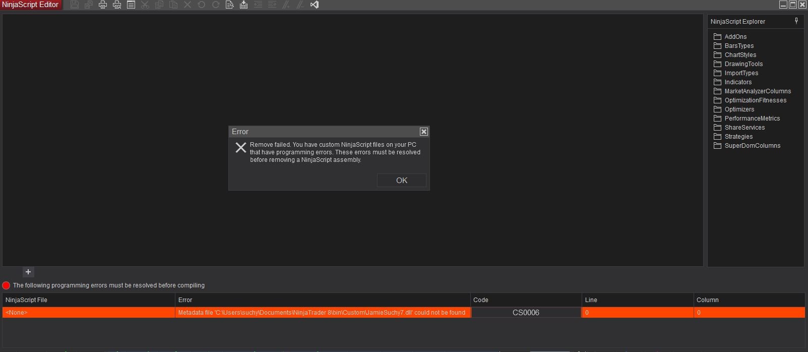 Steps to Resolve:- Right-click within the NinjaScript Editor window and select "References".