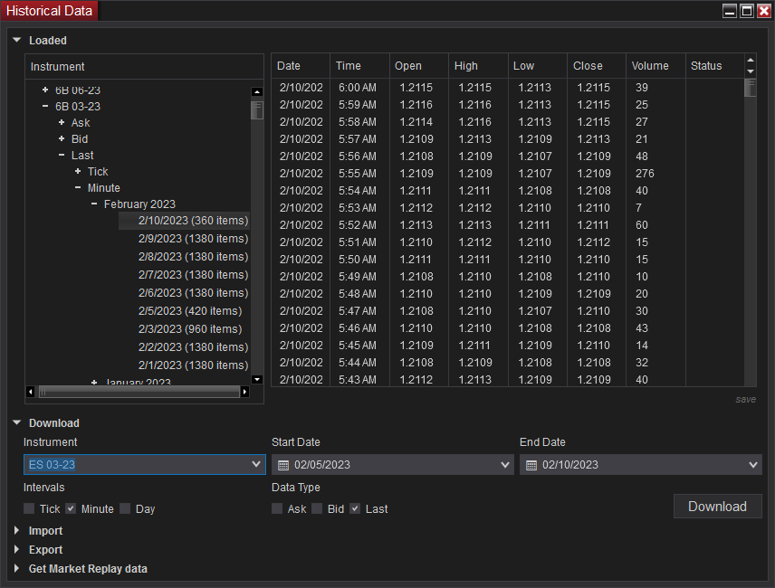Another funny bug. Now that the market is closed I started to download from Interactive Brokers several upcoming futures contracts (ES 06-23, NQ 06-23, 6B 06-23, SI 05-23, ZB 06-23, etc.) to get ready for rollovers. In every case I opened a chart to show the last 2 weeks to a month leading up, e.g. 1/29/23-2/10/23 in each of their local ETH trading hours (CME, CBOT, NYMEX and their contract variant: CME FX Futures ETH, etc.). In EVERY case the data loaded, but stopped at 6 AM on Friday 2/10/23 (360 bars). You can see a picture for 6B below. I noticed this last month as well, but thought maybe it was an anomaly. Nope. It is perfectly consistent.