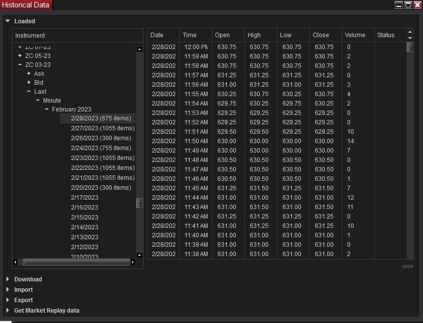 Sorry, just saw this. I don't recall the exact time, but it was between 3 and 4 pm CT when I opened the chart (ZC closes at 1:20 pm CT). I tried opening a chart again and it only showed up to the noon time again. A few minutes later I closed the chart and opened Historical Data to take that snapshot. I then immediately tried a historical download (sun 2/26 - Tue 2/28) and it filled in the missing data up to the 1:20 close.