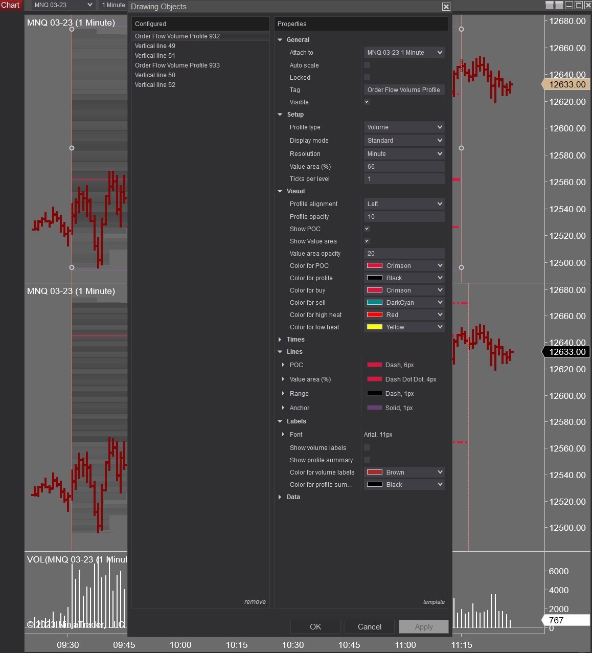 Hello , I have attached two images of MNQ 03-23 charts which shows today's trading activity (2-16-2023) . I have applied Order Flow Volume profile (starting at 9:30 EST) to the to top chart and also did the same to the bottom chart . Note that the Volume Profile for the lower chart is set to calculate only 2 bars more than the top chart but the POC of the volume profile is completely different . It seems to me Volume calculation is not accurate.Tags: None