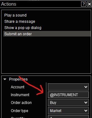 When setting up an alert with the action of submitting an order, can I use a different instrument other than @INSTRUMENT in the instrument field? Example setup the alert on ES chart but submit order on YM instrument. What would the Instrument text for YM or NQ to use in the Instrument field?Tags: None