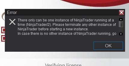 You'll need to end process on that orphaned NinjaTrader.exe. The error message is telling the truth - if it ran (again) there would be two, and it's only allowed to run once at a time. If the old one is stuck and no longer running with an active window you can click on to exit it, you'll need to end the process with task manager. (Or reboot, I suppose, but ending the process is enough.)