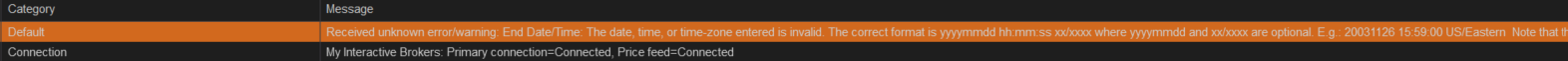 I am trying to use IB date feed and setting up connection via IB gateway. Everything works smooth but i am getting this error. It says date format error it should be mmddyy format. I have no clue how to fix this. Any help will be appreaciated.