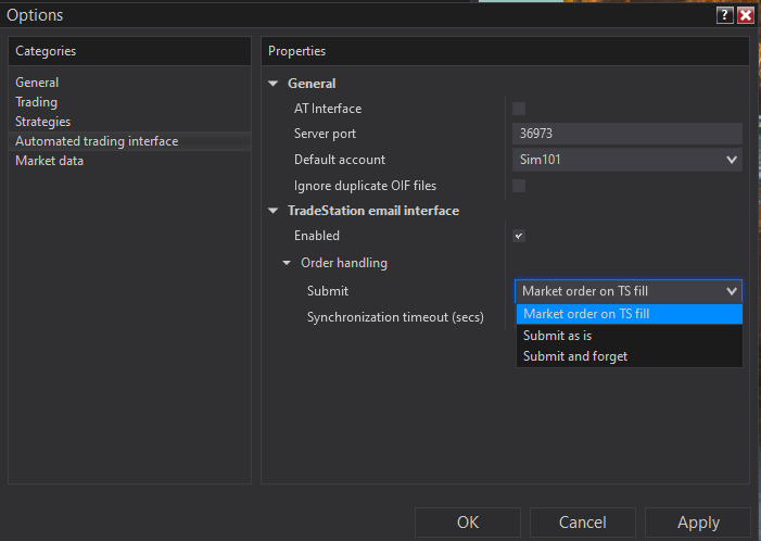 I am not sure what you mean by "reflected" on the NinjaTrader side. The order signals are already being reflected on the Log tab of the Control Center. From what I could tell, none of the orders had actually been filled yet. With "Market order on TS fill" you should see a market order reflected in NinjaTrader once the email interface sends a "Strategy filled order" notification from TradeStation. "Submit as is" results in NinjaTrader creating orders in the platform for the specified type when it gets a "strategy active order" email signal from TradeStation and it also converts any unfilled quantity to a market order or marketable limit order when TradeStation sends a "strategy filled order" email signal. "Submit and forget" will create orders in the platform from the "strategy active order" signal though it will not take any additional action from "strategy filled order" signals.