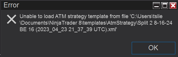 When I open the chart trader all my ATM strategies are listed, but when I try to use one the error message below pops up for all the ATM strategies.Last edited by tsliepen; 04-26-2023, 05:51 AM.