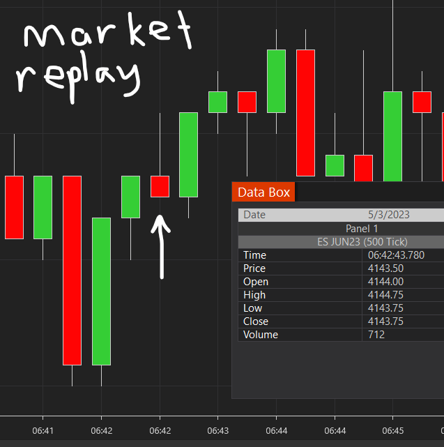 First, I connected to a realtime data feed connection and opened a 500-Tick ES 06-23 chart. Then, I opened a Data Box window and noted the OHLCV values in the Data Box window when hovering the mouse over bars on the chart. Next, I downloaded Market Replay data for the ES 06-23 instrument for the dates 04/27/2023 and 04/28/2023.