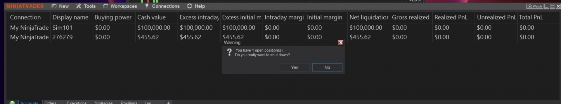 3) When closing NT, it says I have one trade open (which I know I should have), but no trades are apparently open. you can see it on pčic attached