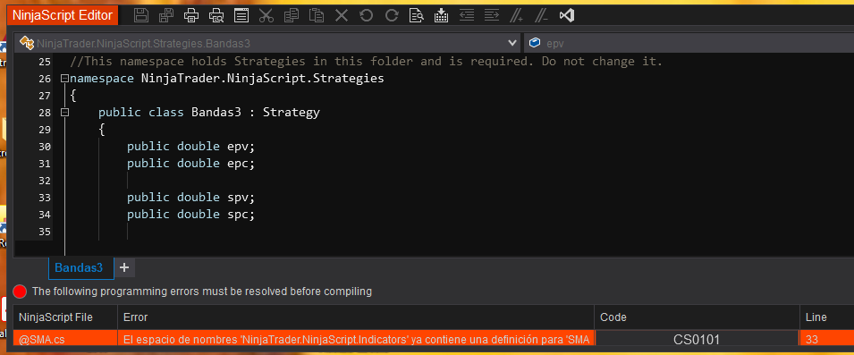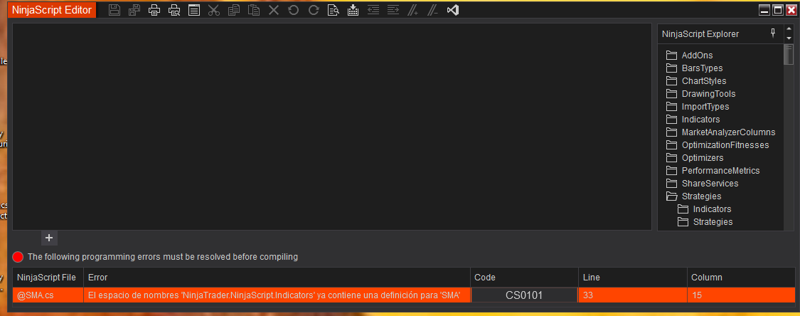 I was working with the NinjaScript editor , and suddenly appeared an error saying that I must solve programming errors with the @SMA.cs indicator.