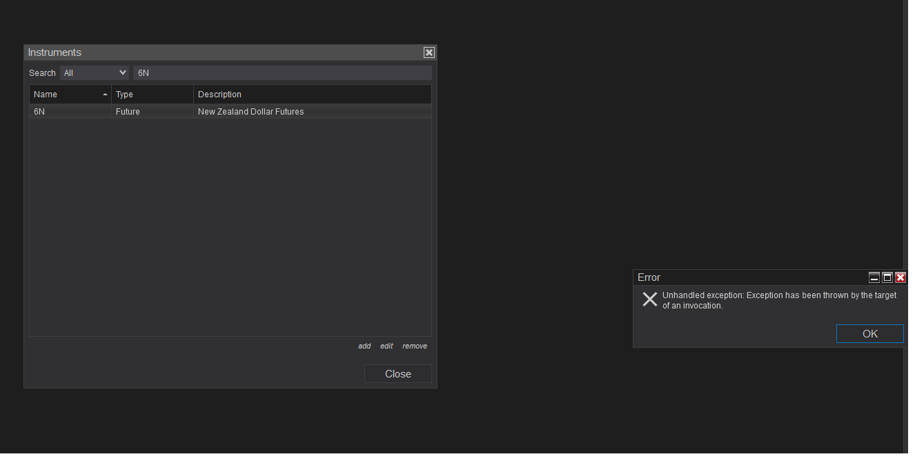 When I am trying to click on "add" or "edit" in "Instruments" menu (Tools->Instruments) I get an error (see in attachment).