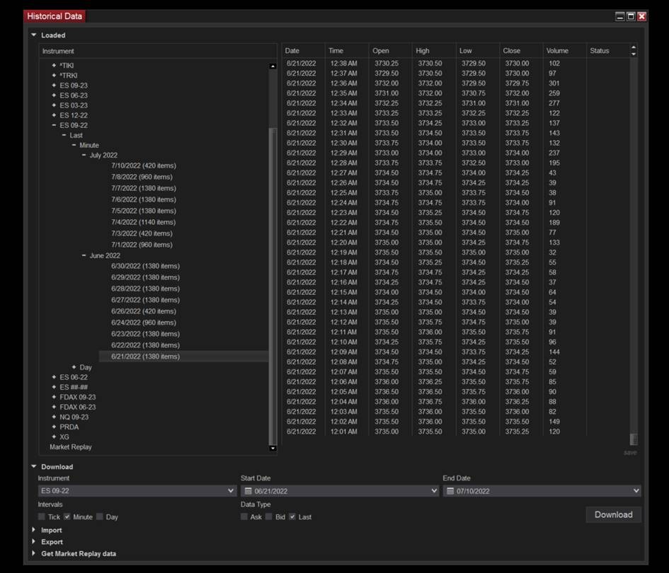 Type ES 06-22 in the Instrument field and hit Enter on your keyboard. Set the start date to June 1st and end date to June 13th. Click Download. The ES futures rolled over from 06-22 to 09-22 on June 13th.