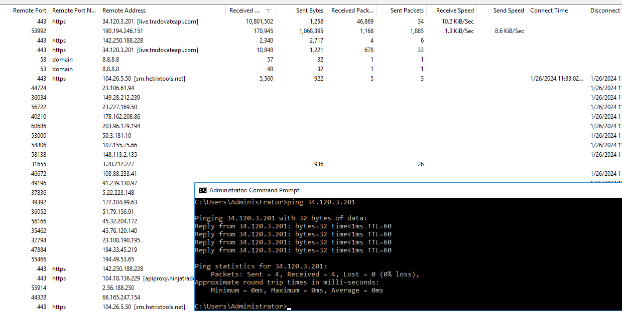 I'm trying to get the IP Address(s) for Live Accounts with Ninjatrader so I can ping them for packet speed and response tests. If there are different IP's for the CME live data vs. an IP that trade executions are actually placed through, is it possible to test both?