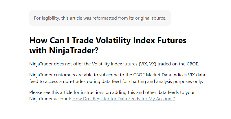 Yes, I am a NT Brokerage User and I have a data package via NT. I am also already connected to the NT Continuum and the ^VIX data is still delayed. I have to constantly refresh the historical data on the chart to get it to populate the most current data.Originally posted by tjfintrade View PostI noticed the same issue. How does this work with using the VIX in strategies? I have a strategy that relies on VIX real-time data? I have no problem getting real-time data on Thinkorswim or TradeStation. How do we get real time data for strategies?