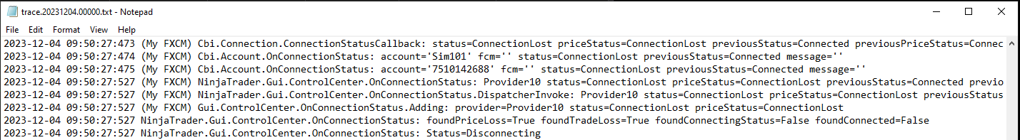 This coincided with a disconnect from FXCM at 10:29am GMT through my Ninjatrader Platform (attached image of trace file).