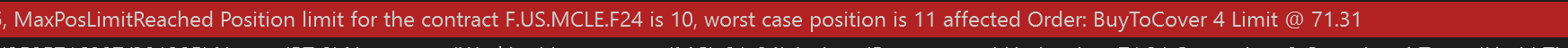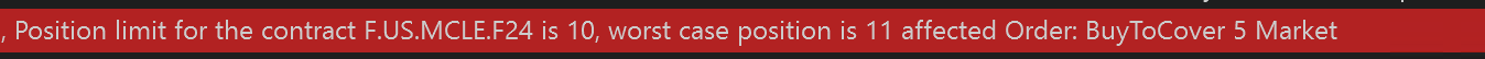 Hello I got an error when my strategy is closing a winning position. I am trading Micro Crude Oil contract with a position size of 5 lots. My understanding is this should be well under any position limits. This is the 2nd consecutive day i have this problem. I trade the strategy through NinjaTrader brokerage and also through a different brokerage using Tradovate. The ninjatrader brokerage acct and Tradovate accounts are different and both were trading micro cl 5 lots at the time.