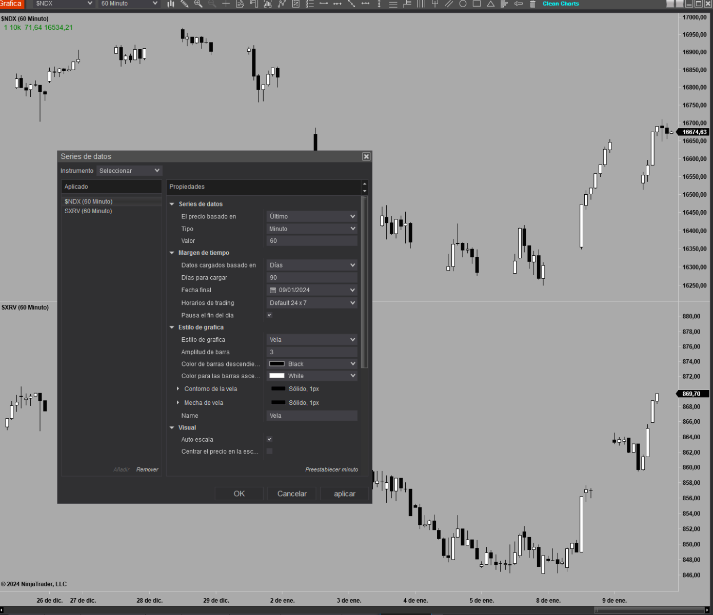 Set the Time frame > Trading hours > To "Default 24x7" for both data series.
