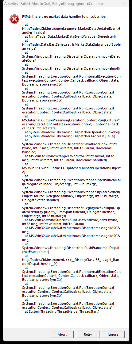 getting this message before NT8 forces a shutdown. I had a seemingly corrupt historical data issue, I cleared the historical data and cache, but the issue persists. I am running 8.1.2.1 I've tried using a gateway connection and regular Rithmic connection, It's even there in safe mode as well. I've tried reinstalling NT8 to no avail.Last edited by Conceptzx; 01-28-2024, 09:32 PM.Tags: None