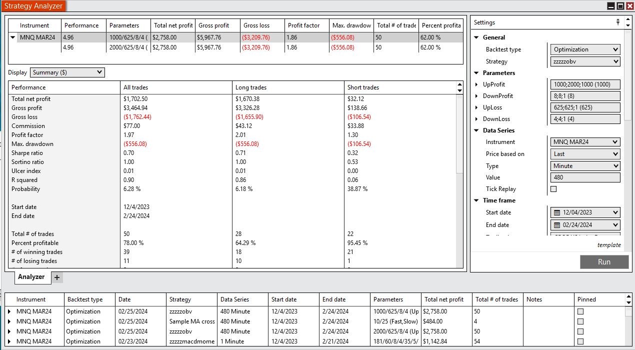 I see your attachment includes the strategy files for zzzzzzzobv.cs & obv.cs. I am not getting any results when testing zzzzzzzobv in the Strategy Analyzer and this appears to be different from the strategy in your screenshot, which I believe contains 5 z's. Are you sure that you sent the correct file?Originally posted by zrobfrank View PostI've attached the .zip file, as requested. Thank you for helping with this. [ATTACH]n1293241[/ATTACH]