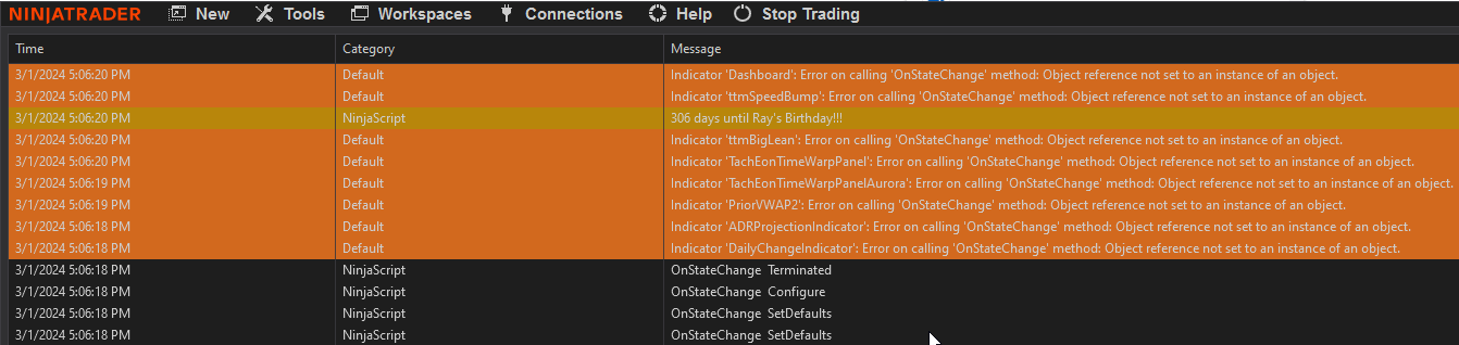When I open a Workspace, I see a bunch of OnStateChange errors relating to 3rd party indicators. This is after the Log shows OnStateChange is terminated. The errors relate to indicators that are not part of the workspace. I removed successfully removed the indicators, but when I restart, I get the same errors with different indicators. I've attached a screenshot. Not sure what to do?