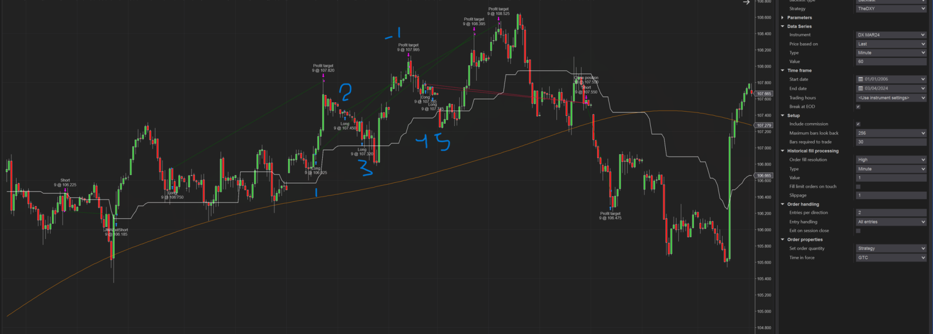 as seen in the screenshot, I have 3 positions opened, then 1 hit profit target, makes total entries opened 2, then then 2 more opened (numbered 4 & 5) before closing any of the previous positions.