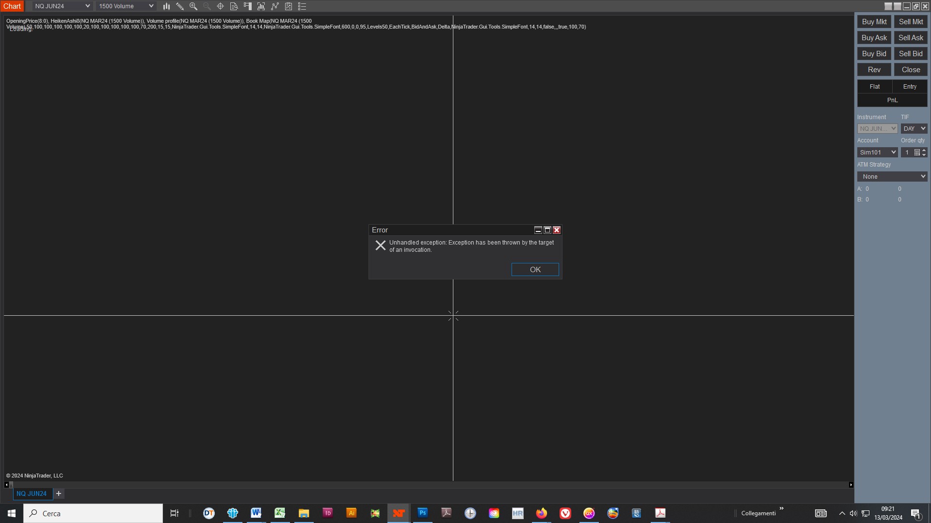 I'm not able to run Ninjatrader 8, cause of an error of unhandled exception. Yesterday I've seen that I wasn't able to upload the NQ charts and this moring i'm not able to connect datas (data simulation).