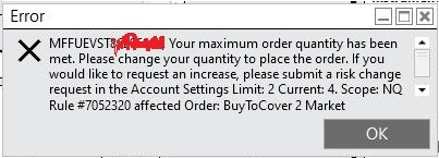 I have 3 MFFU accounts and 2 Apex accounts trading on NinjaTrader 8 Desktop with tradecopier Replikanto. When place 2 mini order on the leader account which is Apex, the MFFU account has the error message as in the picture attached. Could you help to let me know what I should do to get it solved? -