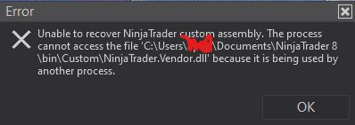 This error message indicates that NinjaTrader's files are being used by a background process and it will not let any other program use them until it has been stopped.