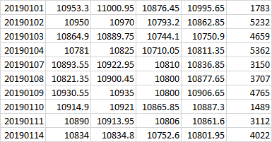 | 20190104 | 10781 | 10825 | 10710.05 | 10811.35 | 5362 |