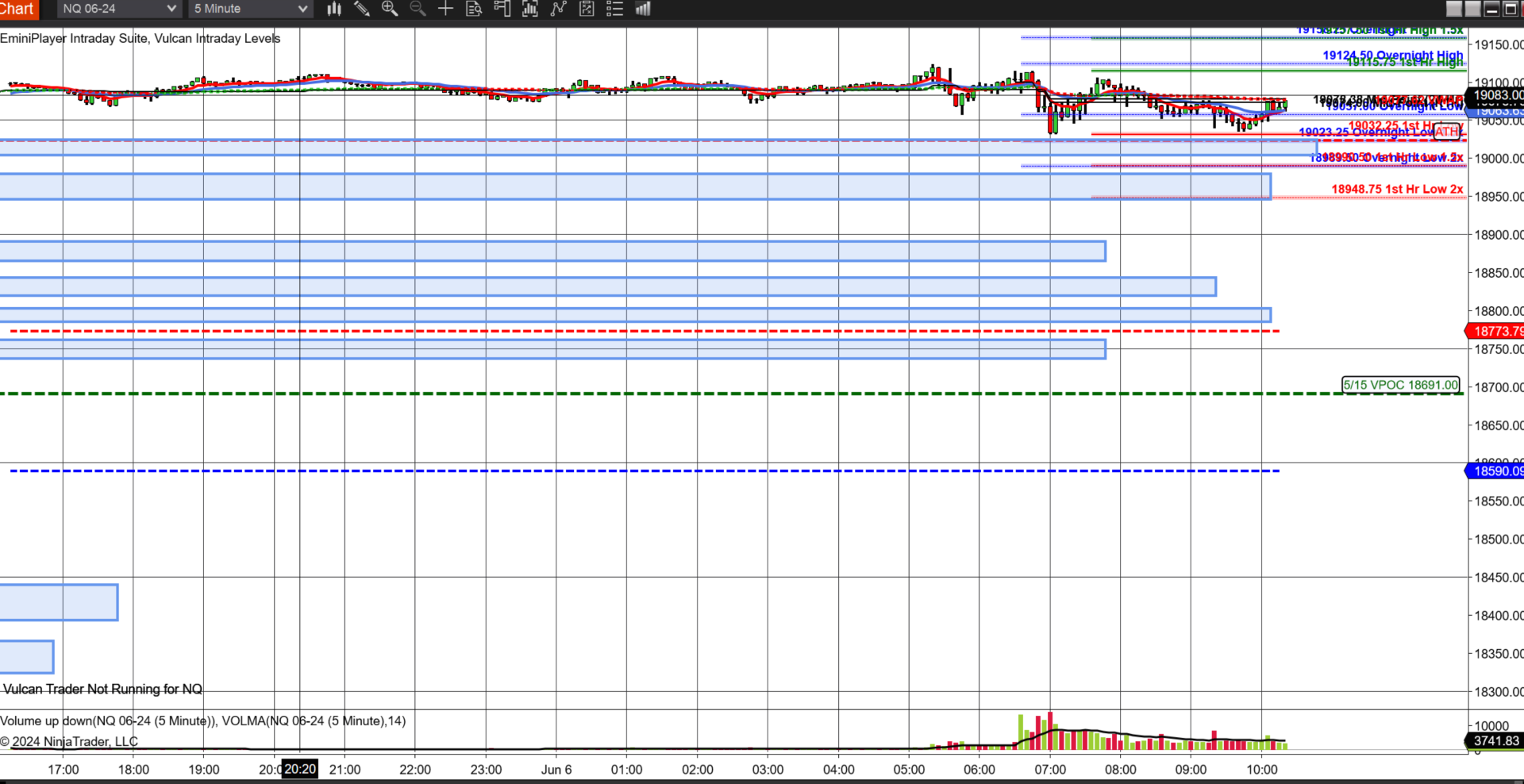 The prices for NQ 6-24 suddenly became compressed at the very top portion of the chart, but only on a 5 minute chart. If I change the time to 4' or to 10', everything is normal. This doesn't happen for other instruments on the same chart - only for NQ 5'. I created a new chart, and NQ behaves exactly the same - normal on every time frame except 5', but extremely compressed on the 5' chart.