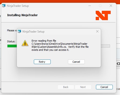 Error reading from file C:\users\horac\Onedrive\Dcocuments\Ninhatrader 8\bin\Custom\AssemblyInfo.cs. Verify that the file exists and that you can access it.