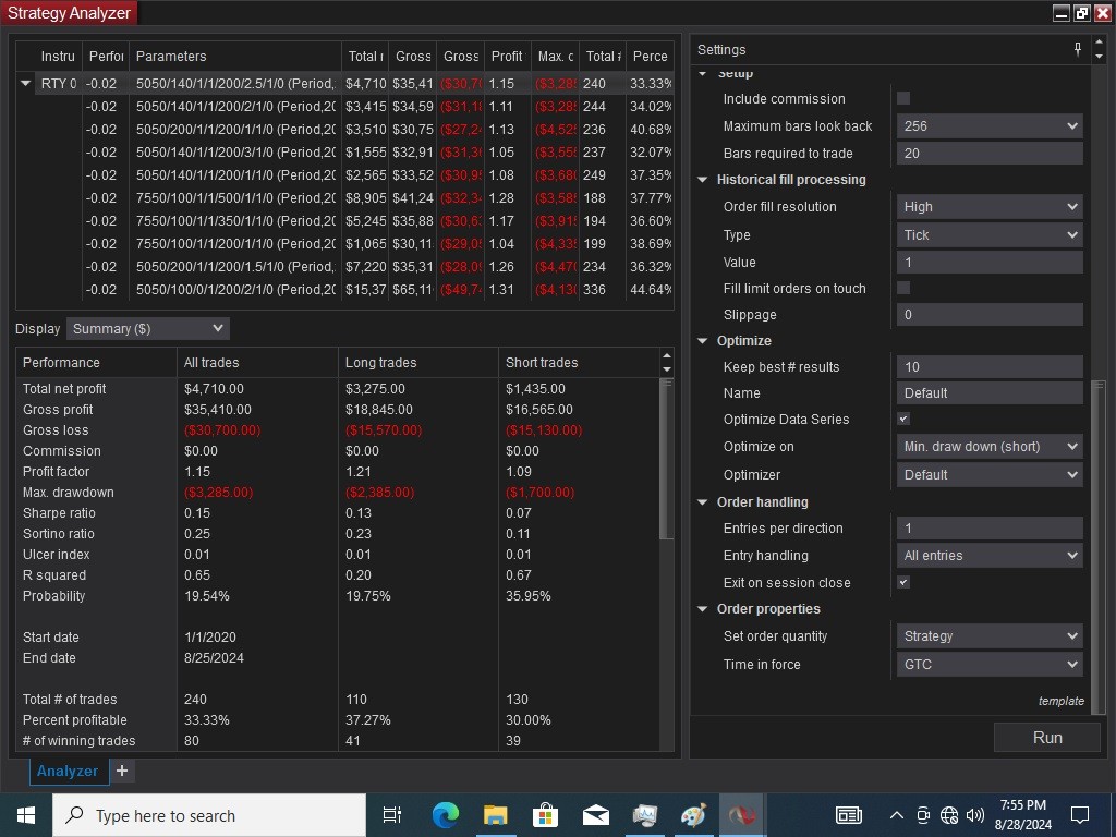 So, when I'm running to Optimize on (Min Draw Down / Long), why doesn't it generate the same result as just doing no short trades? It seems like to get the best test result, I'm going to need to bifurcate my candidate strategies into a Long / Short half, and then test each half, which then doubles my testing load.