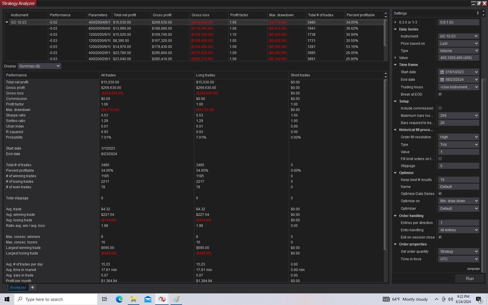 When I ran the Optimizer on Min Draw Down / Long, I got a result of -$19K. When I took that same strategy and commented out the short trades, so it could only do long trades, and then the Optimizer on it, I got a result of +$15K.